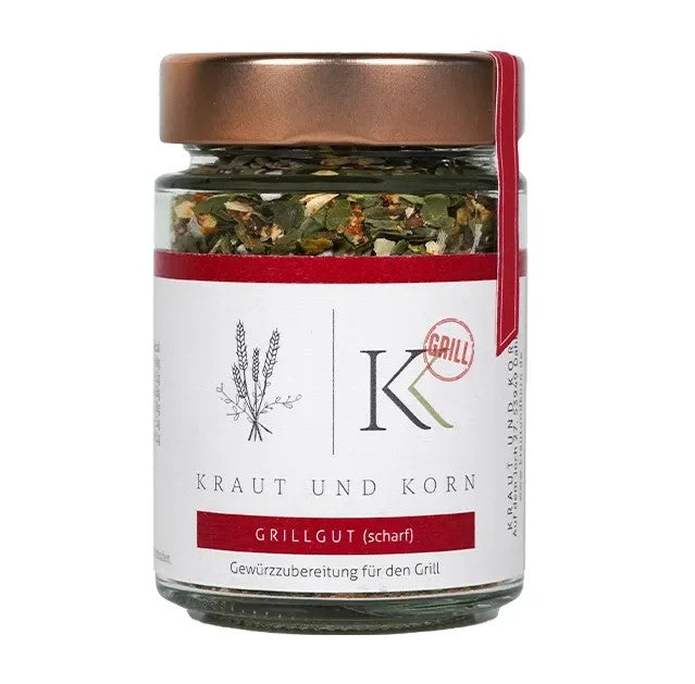 Klirrende Bierflaschen und knuspriges Weißbrot gehen als Vorband an den Start. Der eigentliche Star des Abends ist noch nicht so weit. In der Küche wartet er auf seine würzige Maske, bevor es auf die tosend heiße Bühne geht und dann zart brutzelnd die Show beginnt. An Grillabenden dreht sich alles – na klar – um leckeres Grillgut, von Steak bis Tofu. Und wir haben die richtige Würze dafür: Schnell, selbstgemacht und ohne Zusatzstoffe. Es zischt, es brutzelt und es duftet… und zwar richtig gut. Alles was es dafür braucht, ist Fleisch, Fisch, Gemüse oder Tofu und eine leckere Würze. Ja – Fleisch und Co. kannst du auch fertig eingelegt kaufen. Manchmal soll es aber etwas Besonderes sein. Denn wer grillt, der isst nicht einfach, sondern zelebriert die frisch gegarten Leckereien. So ist das zumindest bei uns im Kraut und Korn-Team. Und für alle Würste-Wender und Steak-Sachverständige haben wir die perfekte Grundwürze für eine einfache – aber super leckere Marinade entwickelt: Unser Grillgut. Zwiebeln und Bärlauch geben deftige Würze, Tomaten einen fruchtigen Hauch, die gelbe Amazonas Chilli intensive Schärfe, Paprika rundet das Gesamtbild ab. Und das naturreine Alpensalz? Verleiht dem Grillgut ein einzigartiges Mundgefühl: Einen mineralischen Crunch, der beim Grillen erhalten bleibt. Probier es aus!