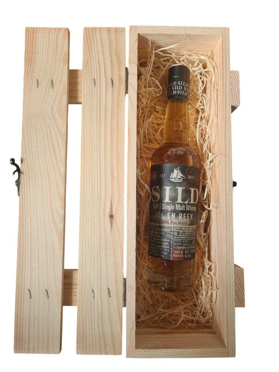 Holzlattenbox mit Verschluss und einer Flasche SILD Jöl en Reek Single Malt Whisky