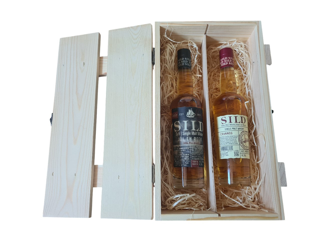 Holzlattenbox mit Verschluss und zwei Flaschen SILD Single Malt Whisky